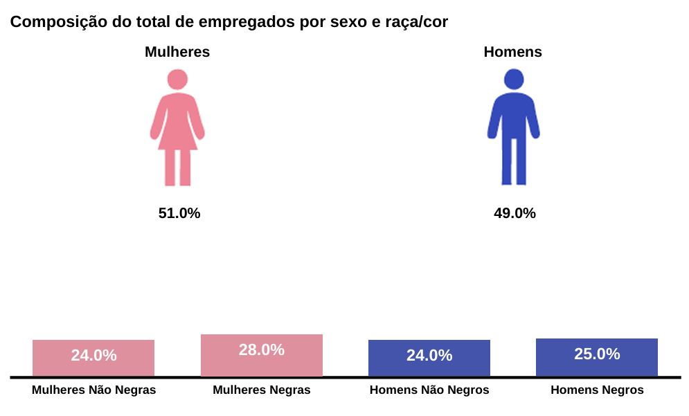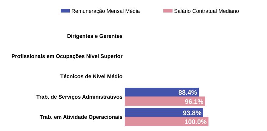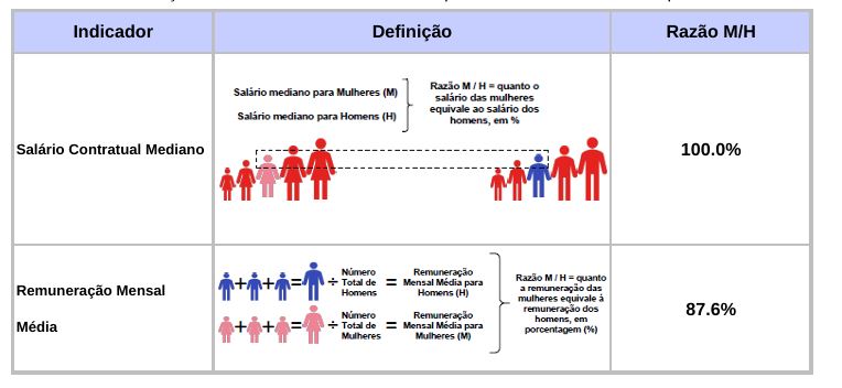 - O salário contratual mediano das mulheres equivale a 100,0% do recebido pelos homens.